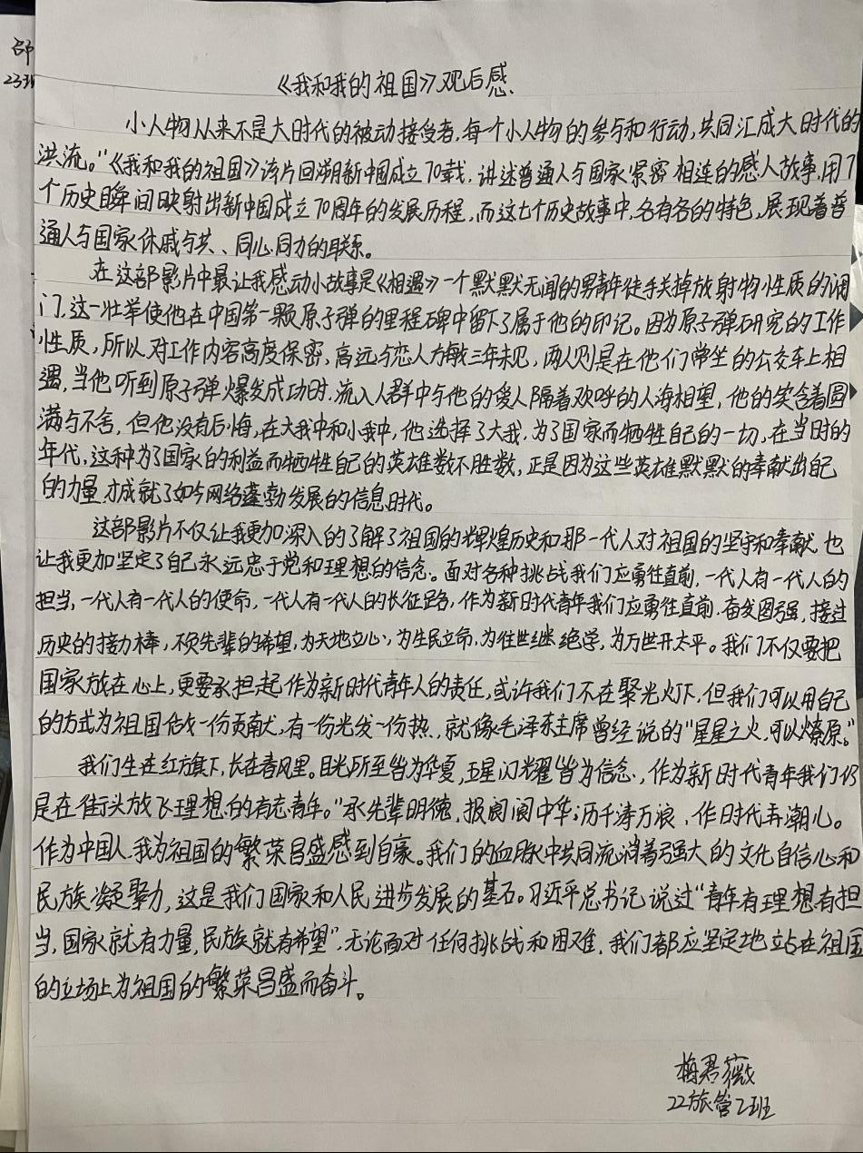 观影现场气氛热烈,同学们聚精会神地观看着影片。当银幕上呈现出开国大典的盛况、第一颗原子弹爆炸成功的激动时刻、中国女排夺得奥运会冠军的喜悦瞬间,以及香港回归、北京奥运会举办等历史性时刻时,现场同学们纷纷拿出纸笔记录自己此时此刻的感悟。