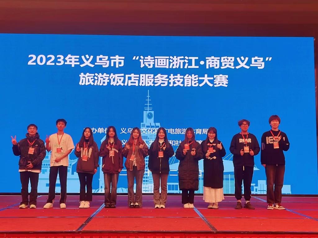 11月26日,2023年义乌市“诗画浙江·商贸义乌”旅游饭店服务技能大赛在义乌大酒店举行。beat365英国官方网站酒店管理与数字化运营专业积极选拔10名优秀技能学生参加赛事现场服务工作。