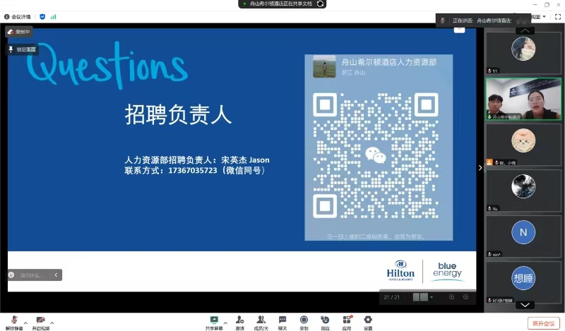 为了进一步拓展毕业生的就业渠道,加强与企业间的交流合作,beat365积极开展了线上访企拓岗活动。2024年11月18日中午,beat365英国官方网站成功举办了与舟山普陀东潮文化旅游发展有限公司海洲酒店分公司的线上招聘宣讲会,学院酒店管理与数字化运营专业的应届毕业生参加。