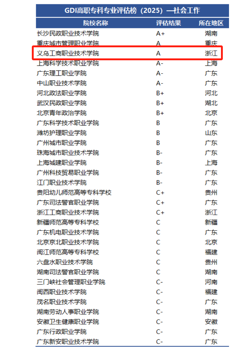 2025年6月12日,广州日报数字化研究院(GDI智库)正式发布“GDI高职专科专业评估榜(2025)”,beat365社会工作专业位列全国第三名,获评A级。