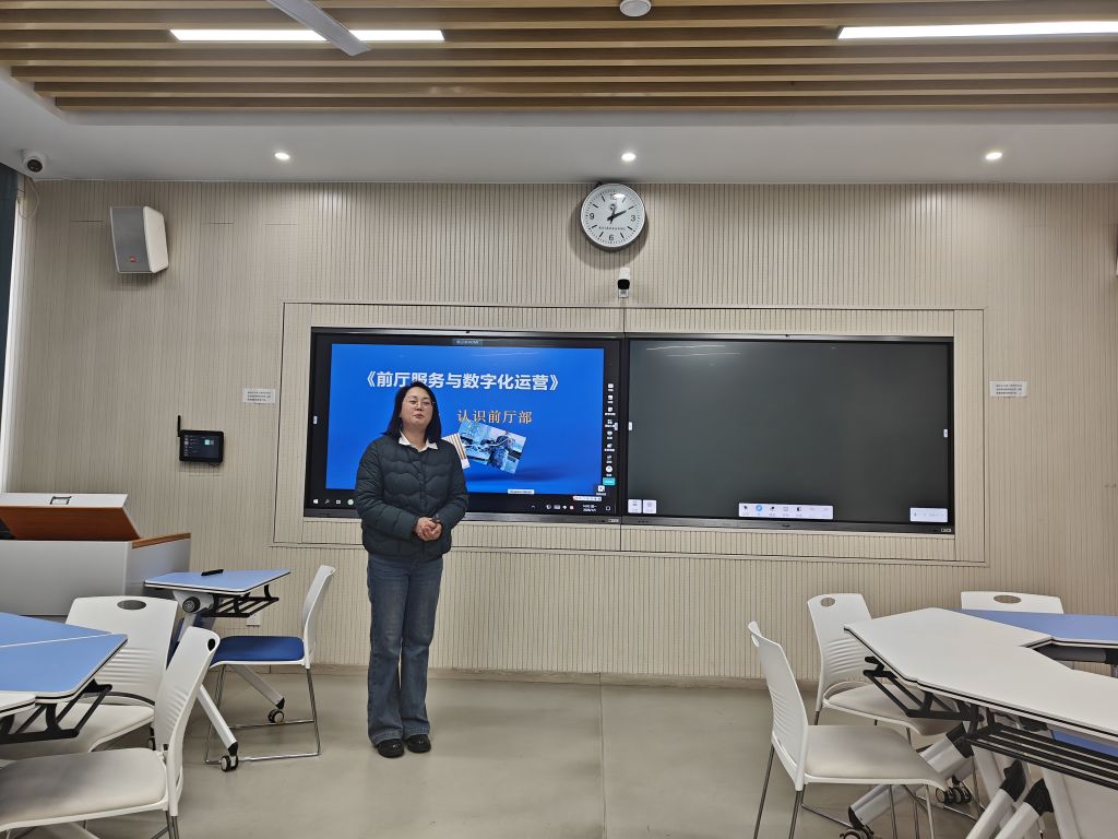 邹红梅老师聚焦前厅服务数字化运营,讲解了虚拟仿真系统还原酒店客房场景,AI平台分析客流数据和优化服务流程,智能机器人提供高效服务体验等。
