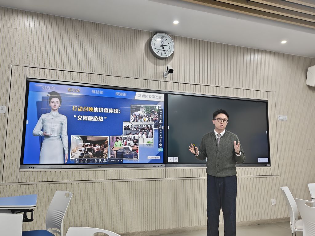 辛岛老师则以《走进大英博物馆》短剧小玉壶角色为切入点,引入数字人“小玉壶”老师辅助讲授新媒体文案写作技巧,从三个维度帮助学生掌握“文化IP+流量密码”的创作方法。